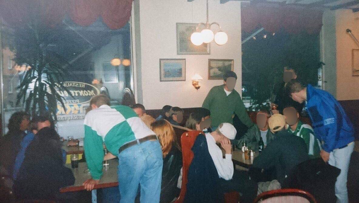 Taktiken var att visa leget en gång, gå tillbaka redan dagen efter så man blev igenkänd, och sen jobba sig upp till stammis och aldrig behöva visa det igen. Ahmed på Monte Bianco måste verkligen ha velat tro på eländet, för vi var inne direkt. Sen var det som att öppna dammluckorna. På bilden är det fortfarande mest Sofia, men också Zinken, Hornstull och Eriksdal, polare från Dalen och Husby och ett par tjejer från Södra Latin, som varvar ner efter match eller varvar upp inför helgen. Det sticker faktiskt fram en klassisk vintant i bakgrunden, men förutom några slitna grannar var det i princip en ungdomsgård vid det här laget.