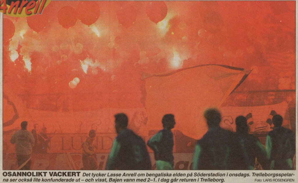 Nja, från Söder hördes ändå, som så ofta, lite andra tongångar. I Aftonbladet gav Sofias egen Lasse Anrell sin syn på eldandet. Lasse, tokbajare och bosatt vid Färgargårdstorget, denna fett äkta 80-talspärla inkilad mellan Vita Bergen och Hammarby Sjö, hade inga problem med att se det vackra och passionerade i den här senaste formen av kärleksyttringar från läktarna. Att han har ett exceptionellt öga för dynamik och alternativ finkultur blev ju ännu mer tydligt senare, när han hyllade kritaen5a i sin krönika och gjorde fotbolls-VM i deras klassiska tröja.