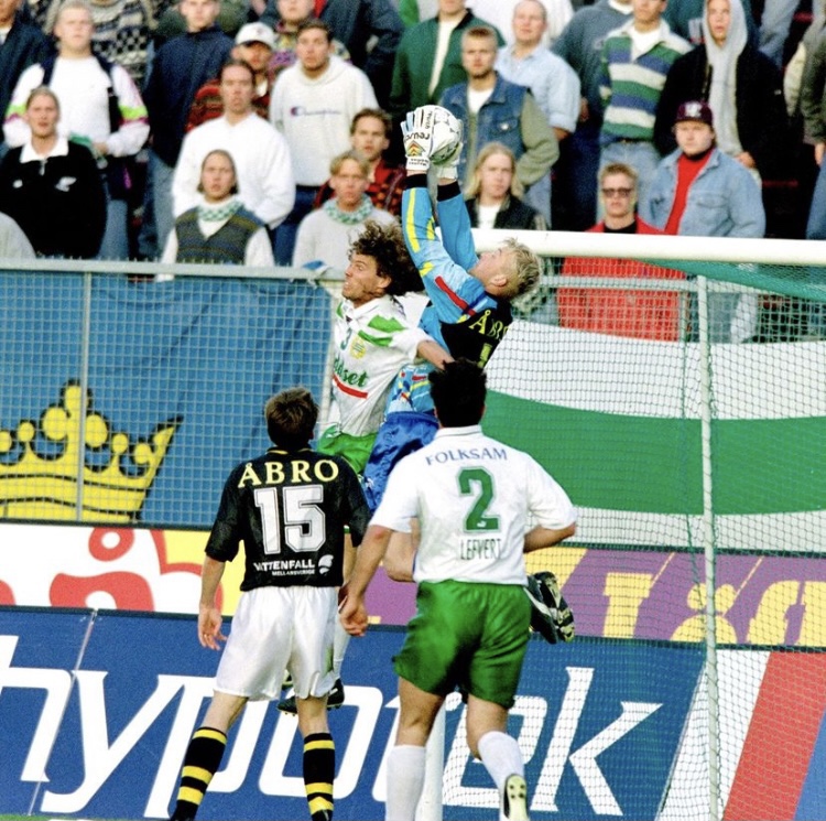 Ser man en gammal bild scannar man ju alltid av spelarna, motstånd, vad det kan vara för år och sen vad som pågår på läktaren. Den här bilden flimrade förbi och blicken fastnade på flaggan med S:t Erik. Det ser ut som en sån som Stockholm stad använde utanför simhallar och bibliotek, och det är exakt vad det är.